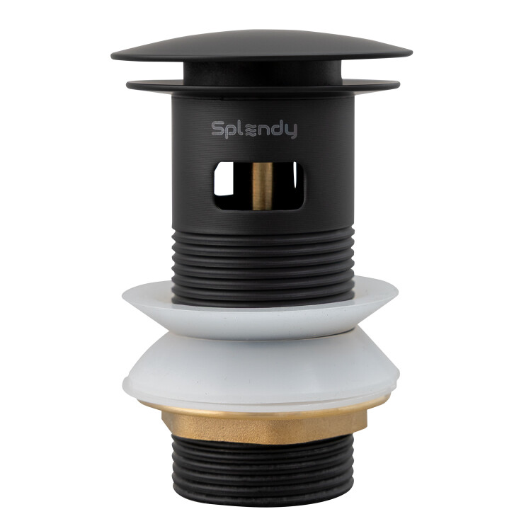 Донный клапан, Splendy, для раковин, с переливом, нажимной Click Clack, 1 1/4", форма крышки-круглая, диаметр крышки, мм-65, материал крышки-металл, цвет-черный матовый Донный клапан, Splendy, для раковин, с переливом, 1 1/4", цвет-черный матовый