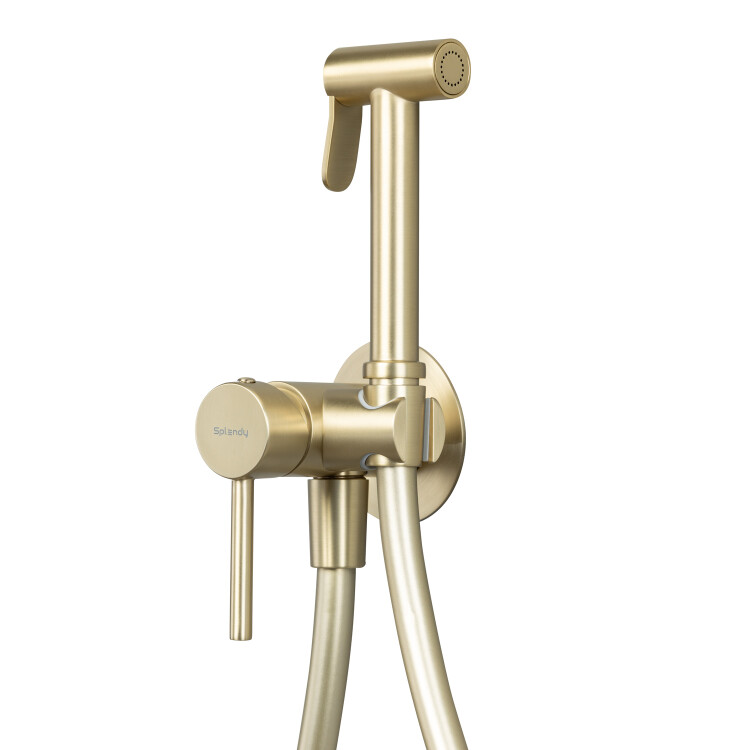 Гигиенический душ, Splendy, Joy, смеситель-в комплекте, тип открывания воды-однорычажный, тип регулирования воды-керамический картридж, монтаж-настенный встраиваемый, внутренняя часть-в комплекте, шланг из ПВХ-есть, длина шланга, мм-1200, шланговое подключение с держателем-в комплекте, материал-латунь, цвет-золото матовое (брашированное) Гигиенический душ, Splendy, Joy, цвет-золото матовое (брашированное)