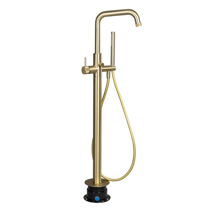 Смеситель для ванны, Splendy, Passion, на 2 потребителя, тип открывания воды-однорычажный, тип регулирования воды-керамический картридж, монтаж-напольный, отверстия для монтажа-1, высота,мм-1083, вынос излива, мм-253, тип излива-неподвижный, ручной душ-в комплекте, количество режимов ручного душа-1, шланг-есть, длина шланга,мм-1500, материал шланга-ПВХ, с держателем ручного душа, внутренняя часть-в комплекте, цвет-золото матовое (брашированное) Смеситель для ванны, Splendy, Passion, на 2 потребителя, цвет-золото матовое (брашированное)