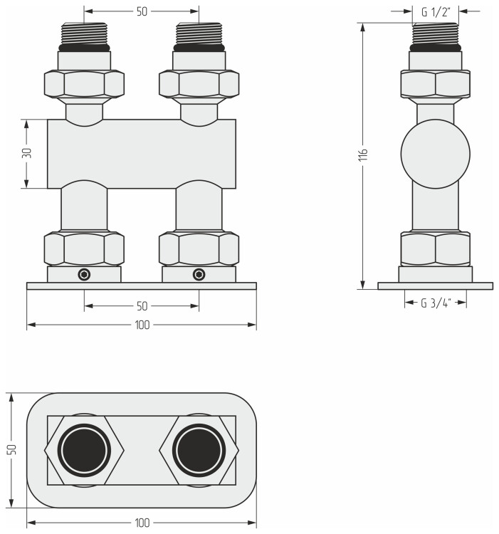 Модуль, Сунержа, прямой EU50, для водяных полотенцесушителей, ширина,мм-100, глубина,мм-50, высота,мм-116, присоединение-2 х НР G 1/2" / 2 х НГ G 3/4", материал-нержавеющая сталь, цвет-сталь (без покрытия) Модуль, Сунержа, прямой EU50, для водяных полотенцесушителей, цвет-сталь (без покрытия)