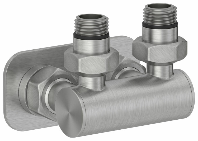 Модуль, Сунержа, угловой EU50, для водяных полотенцесушителей, ширина,мм-100, глубина,мм-74, высота,мм-82, присоединение-2 х НР G 1/2" / 2 х НГ G 3/4", материал-нержавеющая сталь, цвет-сатин Модуль, Сунержа, угловой EU50, для водяных полотенцесушителей, цвет-сатин