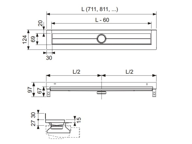 Дренажный канал, TECE, TECEdrainlinе, ширина, мм-124, длина, мм-700, высота, мм-97, монтаж-пристенный, сифон-необходимо заказать, опоры-необходимо заказать, декоративная решетка-необходимо заказать, материал-нержавеющая сталь Дренажный канал, TECE, TECEdrainlinе, шдв 124*700*97