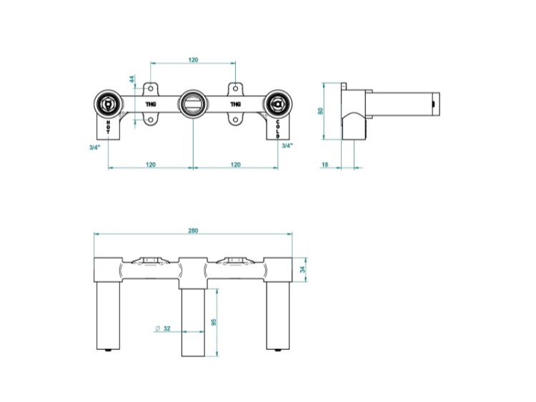 Внутрення часть, THG, назначение-для смесителя настенного на 3 отверстия на пластине, стандарт подвода воды-3/4" Внутрення часть, THG, для смесителя