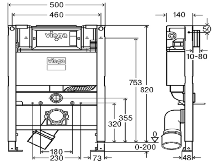 Инсталляция, Viega, Prevista, для унитаза, ширина, мм-500, глубина, мм-140, высота, мм-820, материал-сталь/полиэтилен, тип смыва-двойной, крепёж-без креплений, рама (40х40) с порошковым напылением, бачок скрытого монтажа 3L, дополнительная труба для подключения унитаза-биде, присоединительный комплект для унитаза, выдвижные фиксирующиеся опоры для регулировки высоты, подключение воды R½, регулируемое по глубине соединительное колено для унитаза DN90 из PP, эксцентриковый переходник DN90/100 из РР Инсталляция, Viega, Prevista, для унитаза, шгв 500*140*820