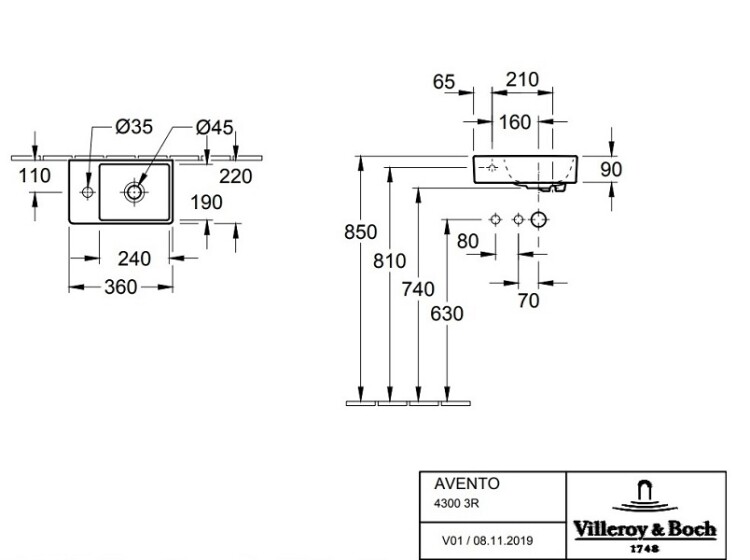 Раковина, Villeroy&Boch, Avento, ширина, мм-360, глубина, мм-220, высота, мм-90, отверстия для смесителя-1, материал-керамика, цвет-альпийский белый, компактная, чаша раковины справа Раковина, Villeroy&Boch, Avento, шгв 360*220*90, отверстия для смесителя-1, цвет-альпийский белый