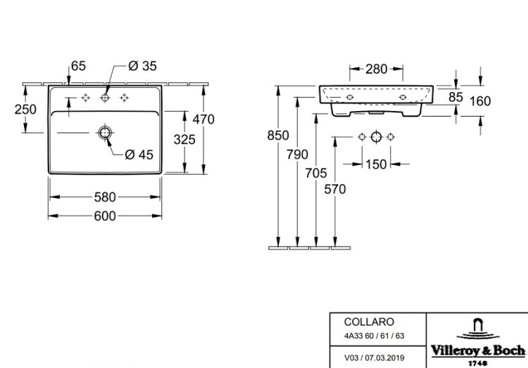 Раковина, Villeroy&Boch, Collaro, ширина, мм-600, глубина, мм-470, высота, мм-160, отверстия для смесителя-1, перелив-есть, материал-TitanCeram, цвет-альпийский белый Раковина, Villeroy&Boch, Collaro, шгв 600*470*160, отверстия для смесителя-1, цвет-альпийский белый