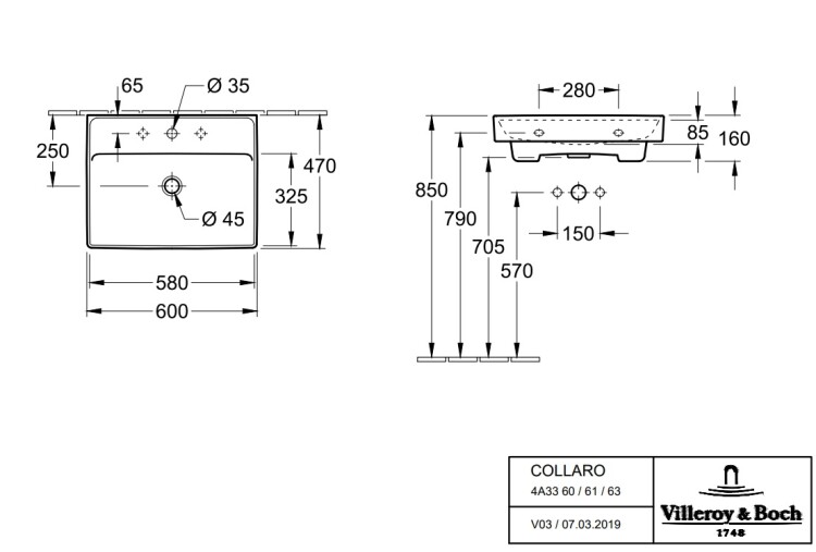 Раковина, Villeroy&Boch, Collaro, ширина, мм-600, глубина, мм-470, высота, мм-160, тип установки-подвесной, отверстия для смесителя-1 сквозное, 2 промаркированных, без перелива, материал-TitanCeram, вид грязеотталкивающего покрытия-CeramicPlus, цвет-альпийский белый Раковина, Villeroy&Boch, Collaro, шгв 600*470*160, отверстия для смесителя-1 сквозное, 2 промаркированных, CeramicPlus, цвет-альпийский белый