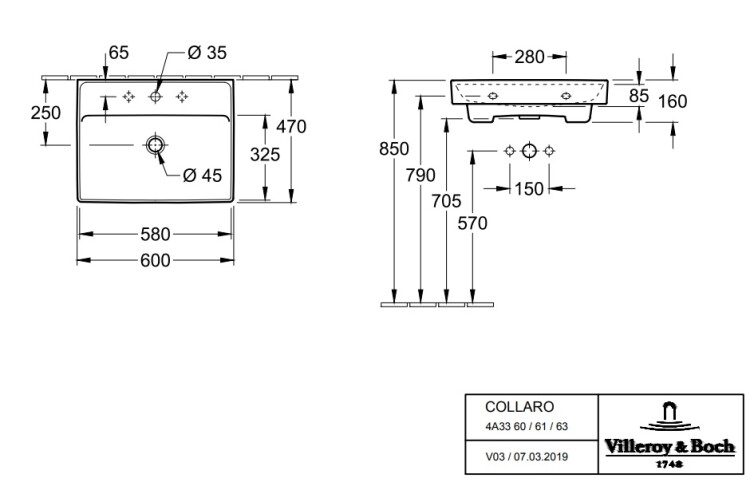 Раковина, Villeroy&Boch, Collaro, ширина, мм-600, глубина, мм-470, высота, мм-160, тип установки-встраиваемый/подвесной, отверстия для смесителя-1 сквозное, 2 промаркированных, без перелива, материал-TitanCeram, цвет-альпийский белый Раковина, Villeroy&Boch, Collaro, шгв 600*470*160, отверстия для смесителя-1 сквозное, 2 промаркированных, цвет-альпийский белый