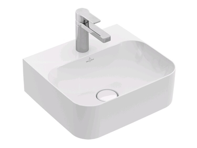 Раковина, Villeroy&Boch, Finion, ширина, мм-430, глубина, мм-390, высота, мм-105, тип установки-на стене, отверстия для смесителя-одно, комплектация-с незапираемым клапаном, клапан с керамической крышкой, грязеотталкивающее покрытие-CeramicPlus, цвет-альпийский белый Раковина, Villeroy&Boch, Finion, шг 430*390*105, CeramicPlus, цвет-альпийский белый