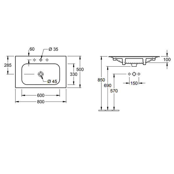 Раковина, Villeroy&Boch, Finion, ширина, мм-800, глубина, мм-500, отверстия для смесителя-одно, декор-без декора, грязеотталкивающее покрытие-CeramicPlus, цвет-альпийский белый Раковина, Villeroy&Boch, Finion, шг 800*500, CeramicPlus, цвет-альпийский белый
