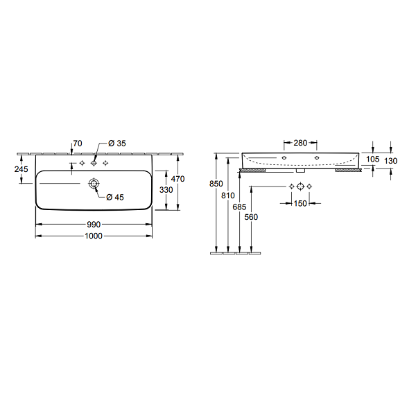 Раковина, Villeroy&Boch, Finion, ширина, мм-1000, глубина, мм-470, высота, мм-130, отверстия для смесителя-одно, материал-керамика, грязеотталкивающее покрытие-CeramicPlus, цвет-альпийский белый Раковина, Villeroy&Boch, Finion, шгв 1000*470*130, CeramicPlus, цвет-альпийский белый