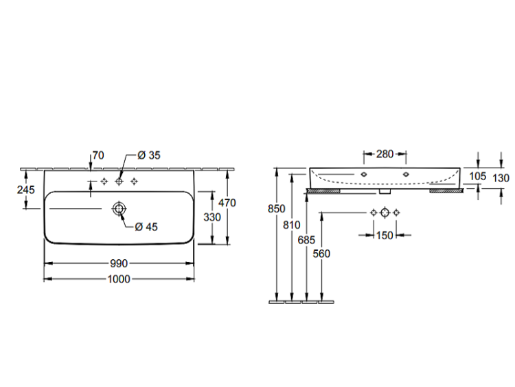 Раковина, Villeroy&Boch, Finion, ширина, мм-1000, глубина, мм-470, высота, мм-165, отверстия для смесителя-1 сквозное, 2 промаркированных, материал-TitanCeram, вид грязеотталкивающего покрытия-CeramicPlus, цвет-альпийский белый, с незапираемым клапаном, клапан с керамической крышкой Раковина, Villeroy&Boch, Finion, шгв 1000*470*165, отверстия для смесителя-1 сквозное, 2 промаркированных, CeramicPlus, цвет-альпийский белый