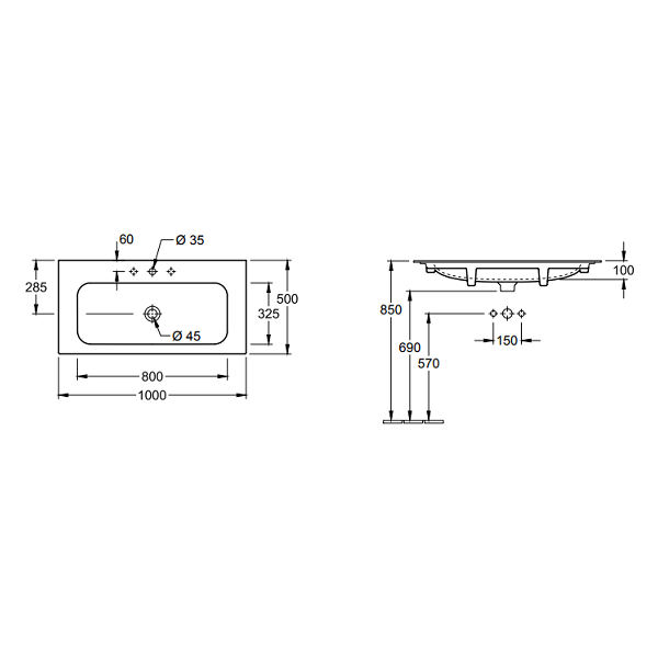 Раковина, Villeroy&Boch, Finion, ширина, мм-1000, глубина, мм-500, высота, мм-100, отверстия для смесителя-одно, перелив-есть, тип перелива-скрытый, декор-без декора, материал-TitanCeram, грязеотталкивающее покрытие-CeramicPlus, цвет-альпийский белый Раковина, Villeroy&Boch, Finion, шгв 1000*500*100, CeramicPlus, цвет-альпийский белый