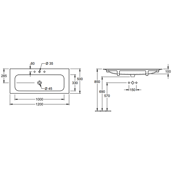 Раковина, Villeroy&Boch, Finion, ширина, мм-1200, глубина, мм-500, высота, мм-100, отверстия для смесителя-одно, декор-без декора, материал-TitanCeram, грязеотталкивающее покрытие-CeramicPlus, цвет-альпийский белый Раковина, Villeroy&Boch, Finion, шгв 1200*500*100, CeramicPlus, цвет-альпийский белый