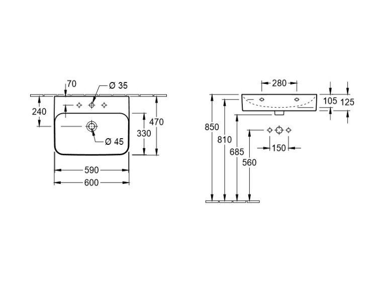 Раковина, Villeroy&Boch, Finion, ширина, мм-600, глубина, мм-470, высота, мм-125, тип установки-настенный, отверстия для смесителя-1 сквозное, 2 промаркированных, материал-TitanCeram, вид грязеотталкивающего покрытия-CeramicPlus, цвет-альпийский белый, с незапираемым клапаном, клапан с керамической крышкой Раковина, Villeroy&Boch, Finion, шгв 600*470*125, отверстия для смесителя-1 сквозное, 2 промаркированных, CeramicPlus, цвет-альпийский белый