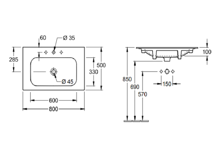 Раковина, Villeroy&Boch, Finion, ширина, мм-800, глубина, мм-500, высота, мм-100, тип установки-на тумбу, отверстия для смесителя-1 сквозное, 2 промаркированных, материал-TitanCeram, вид грязеотталкивающего покрытия-CeramicPlus, цвет-альпийский белый, с незапираемым клапаном, клапан с керамической крышкой Раковина, Villeroy&Boch, Finion, шгв 800*500*100, отверстия для смесителя-1 сквозное, 2 промаркированных, CeramicPlus, цвет-альпийский белый