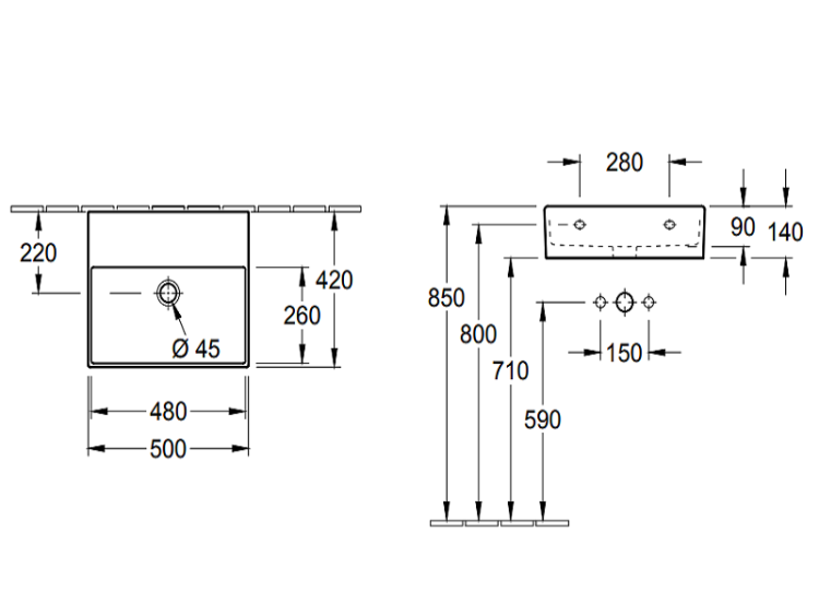 Раковина, Villeroy&Boch, Memento 2.0, ширина, мм-500, глубина, мм-420, высота, мм-140, тип установки-на стене, отверстия для смесителя-отсутствуют, материал-TitanCeram, цвет-белый, прямоугольная модель Раковина, Villeroy&Boch, Memento 2.0, шгв 500*420*140, отверстия для смесителя-отсутствуют, цвет-белый