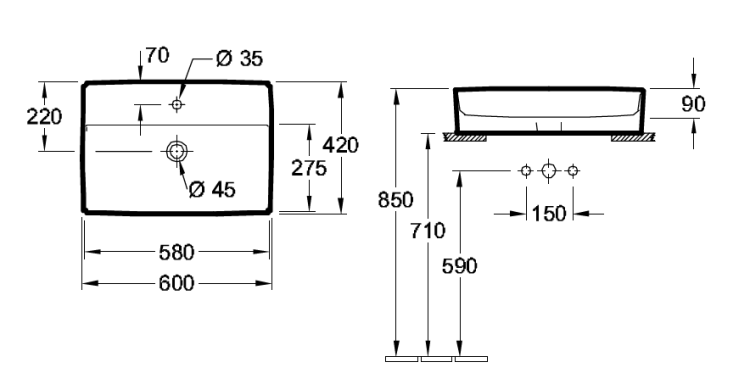 Раковина, Villeroy&Boch, Memento 2.0, ширина, мм-600, глубина, мм-420, высота, мм-90, тип установки-накладной (настольный), отверстия для смесителя-1, с переливом, материал-TitanCeram, вид грязеотталкивающего покрытия-CeramicPlus, цвет-Graphite Раковина, Villeroy&Boch, Memento 2.0, шгв 600*420*90, отверстия для смесителя-1, CeramicPlus, цвет-Graphite