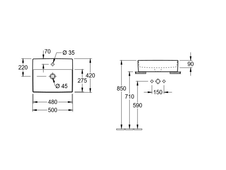 Раковина, Villeroy&Boch, Memento, ширина, мм-500, глубина, мм-420, высота, мм-90, тип установки-на столешницу, отверстия для смесителя-1, перелив-есть, материал-TitanCeram, крепления в комплекте, цвет-альпийский белый Раковина, Villeroy&Boch, Memento, шгв 500*420*90, отверстия для смесителя-1, цвет-альпийский белый