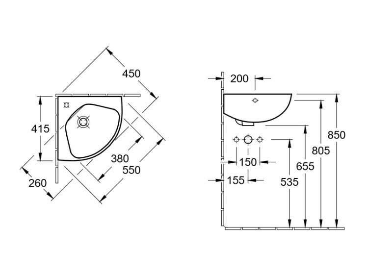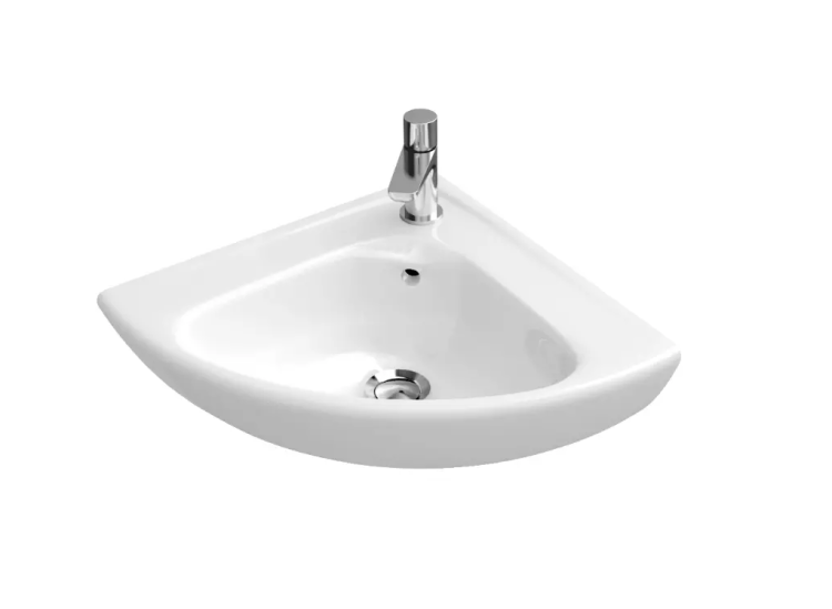 Раковина, Villeroy&Boch, O'Novo, компактная, ширина, мм-550, глубина, мм-415, тип установки-угловой/подвесной, отверстия для смесителя-1, перелив-есть, тип перелива-открытый, материал-санфарфор, вид грязеотталкивающего покрытия-CeramicPlus, цвет-альпийский белый Раковина, Villeroy&Boch, O'Novo, шг 550*415, отверстия для смесителя-1, CeramicPlus, цвет-альпийский белый