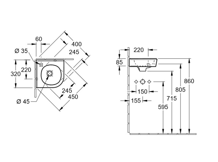 Раковина, Villeroy&Boch, O'Novo, ширина, мм-320, глубина, мм-320, высота, мм-85, тип установки-угловой/подвесной, отверстия для смесителя-1, перелив-есть, материал-санфарфор, цвет-альпийский белый Раковина, Villeroy&Boch, O'Novo, шгв 320*320*85, отверстия для смесителя-1, цвет-альпийский белый