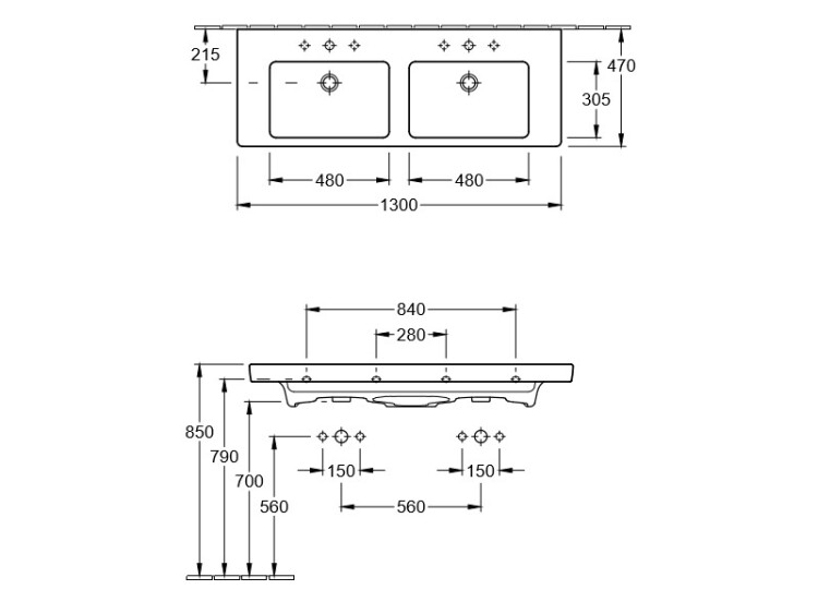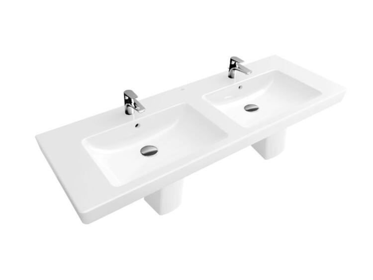 Раковина, Villeroy&Boch, Subway 2.0, двойная, ширина, мм-1300, глубина, мм-470, тип установки-на тумбу, отверстия для смесителя-2 сквозных, 4 промаркированных, перелив-есть, тип перелива-открытый, материал-санфарфор, вид грязеотталкивающего покрытия-CeramicPlus, цвет-альпийский белый Раковина, Villeroy&Boch, Subway 2.0, шг 1300*470, отверстия для смесителя-2 сквозных, 4 промаркированных, CeramicPlus, цвет-альпийский белый
