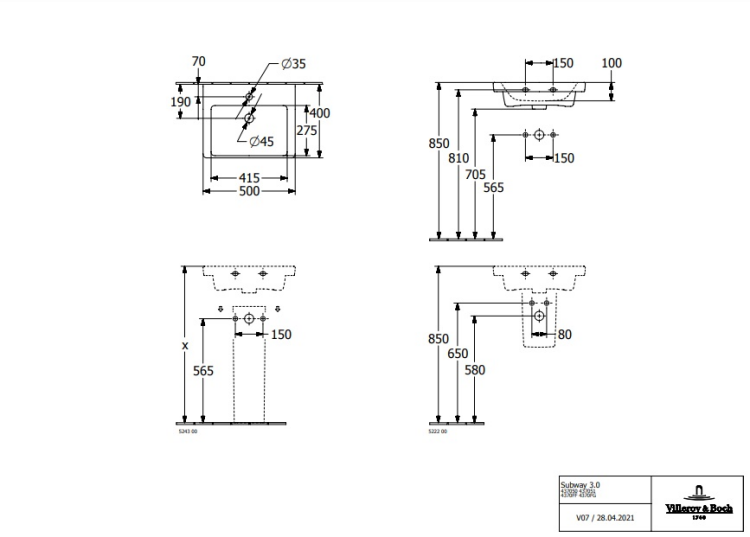 Раковина, Villeroy&Boch, Subway 3.0, ширина, мм-500, глубина, мм-400, высота, мм-100, тип установки-подвесной, отверстия для смесителя-1, с переливом, материал-керамика, цвет-альпийский белый Раковина, Villeroy&Boch, Subway 3.0, шгв 500*400*100, отверстия для смесителя-1, цвет-альпийский белый