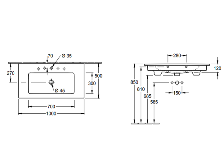 Раковина, Villeroy&Boch, Venticello, ширина, мм-1000, глубина, мм-500, высота, мм-165, тип установки-на тумбу, отверстия для смесителя-1 сквозное, 2 промаркированных, перелив-есть, тип перелива-открытый, материал-керамика, вид грязеотталкивающего покрытия-CeramicPlus, цвет-камень белый Раковина, Villeroy&Boch, Venticello, шгв 1000*500*165, отверстия для смесителя-1 сквозное, 2 промаркированных, CeramicPlus, цвет-камень белый