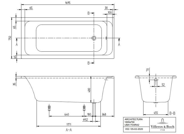 Ванна, Villeroy&Boch, Architectura, ширина, мм-1700, глубина, мм-750, высота, мм-480, водоизмещение (л)-210, тип установки-встраиваемый/пристенный, форма-прямоугольная, слив-перелив-необходимо заказать, диаметр слива, мм-52, ножки-необходимо заказать, материал-акрил, цвет-альпийский белый Ванна, Villeroy&Boch, Architectura, шгв 1700*750*480, цвет-альпийский белый
