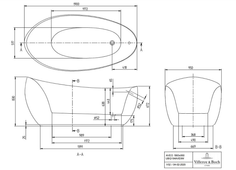 Ванна, Villeroy&Boch, Aveo New Generation, ширина, мм-1900, глубина, мм-950, высота, мм-443, водоизмещение (л)-245, тип установки-отдельностоящий, форма-овальная, слив-перелив-в комплекте, диаметр слива, мм-52, материал-Quaryl, цвет-альпийский белый Ванна, Villeroy&Boch, Aveo New Generation, шгв 1900*950*443, цвет-альпийский белый