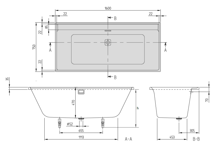 Ванна, Villeroy&Boch, Collaro, ширина, мм-1600, глубина, мм-750, высота, мм-470, водоизмещение (л)-181, тип установки-встраиваемый/пристенный, форма-прямоугольная, хромированный слив-перелив-в комплекте, цвет крышки слива-золото, диаметр слива, мм-52, ножки-необходимо заказать, материал-акрил, цвет-альпийский белый (белый Alpin)/золото Ванна, Villeroy&Boch, Collaro, шгв 1600*750*470, цвет-альпийский белый (белый Alpin)/золото