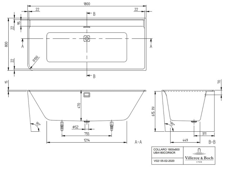 Ванна, Villeroy&Boch, Collaro, ширина, мм-1800, глубина, мм-800, высота, мм-470, водоизмещение (л)-218, тип установки-отдельностоящий, форма-прямоугольная, слив-перелив-в комплекте, цвет крышки слива-хром, диаметр слива, мм-52, ножки-есть, материал-акрил, с задней стенкой, угловая правосторонняя версия, цвет-альпийский белый/хром Ванна, Villeroy&Boch, Collaro, шгв 1800*800*470, цвет-альпийский белый/хром