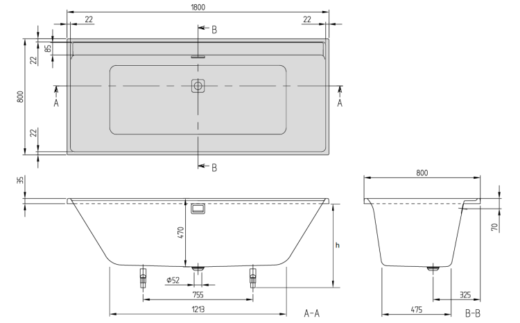 Ванна, Villeroy&Boch, Collaro, ширина, мм-1800, глубина, мм-800, высота, мм-470, водоизмещение (л)-190, тип установки-встраиваемый/пристенный, форма-прямоугольная, хромированный слив-перелив-в комплекте, цвет крышки слива-чёрный матовый, диаметр слива, мм-52, ножки-необходимо заказать, материал-акрил, цвет-альпийский белый/чёрный матовый Ванна, Villeroy&Boch, Collaro, шгв 1800*800*470, цвет-альпийский белый/чёрный матовый