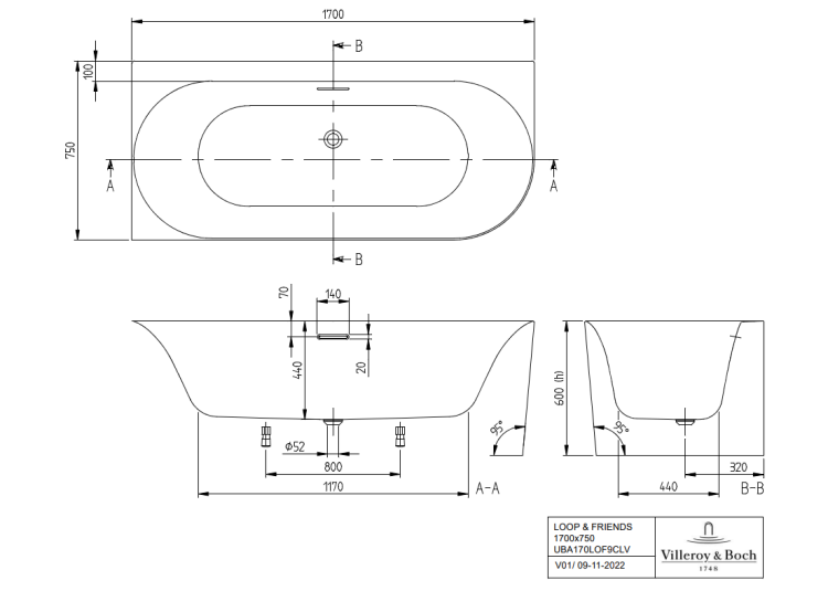 Ванна, Villeroy&Boch, Loop&Friends, ширина, мм-1700, глубина, мм-750, высота, мм-600, водоизмещение (л)-138, тип установки-пристенный, форма-прямоугольная, панель-есть, слив-перелив-необходимо заказать, диаметр слива, мм-52, ножки-есть, материал-акрил, цвет-альпийский белый Ванна, Villeroy&Boch, Loop&Friends, шгв 1700*750*600, цвет-альпийский белый