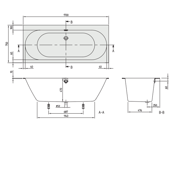 Ванна, Villeroy&Boch, Oberon 2.0, ширина, мм-1700, глубина, мм-750, высота, мм-470, водоизмещение (л)-168, форма-овальная, слив-перелив-в комплекте, диаметр слива, мм-52, ножки-есть, материал-Quaryl, цвет-белый Ванна, Villeroy&Boch, Oberon 2.0, шгв 1700*750*470, цвет-белый