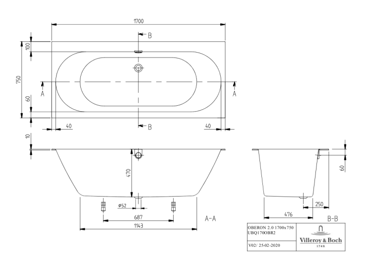 Ванна, Villeroy&Boch, Oberon 2.0, ширина, мм-1700, глубина, мм-750, высота, мм-470, водоизмещение (л)-168, тип установки-встраиваемый/пристенный, форма-прямоугольная, слив-перелив-в комплекте, диаметр слива, мм-52, ножки-есть, самоклеящиеся, регулируются в диапазоне 130 до 180 мм, материал-Quaryl, цвет-камень белый (Stone White) Ванна, Villeroy&Boch, Oberon 2.0, шгв 1700*750*470, цвет-камень белый (Stone White)