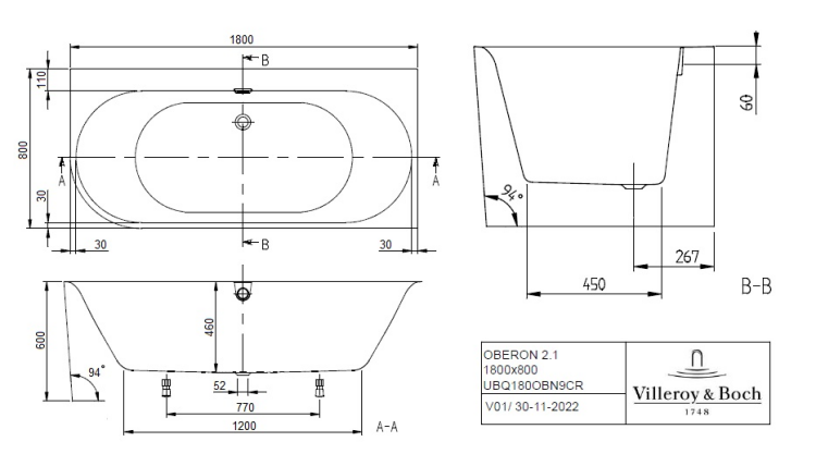 Ванна, Villeroy&Boch, Oberon 2.1, правосторонняя, ширина, мм-1800, глубина, мм-800, высота, мм-460, водоизмещение (л)-183, тип установки-пристенный, форма-овальная, панель-есть, слив-перелив-в комплекте, диаметр слива, мм-52, ножки-есть, материал-Quaryl, цвет-альпийский белый Ванна, Villeroy&Boch, Oberon 2.1, правосторонняя, шгв 1800*800*460, цвет-альпийский белый