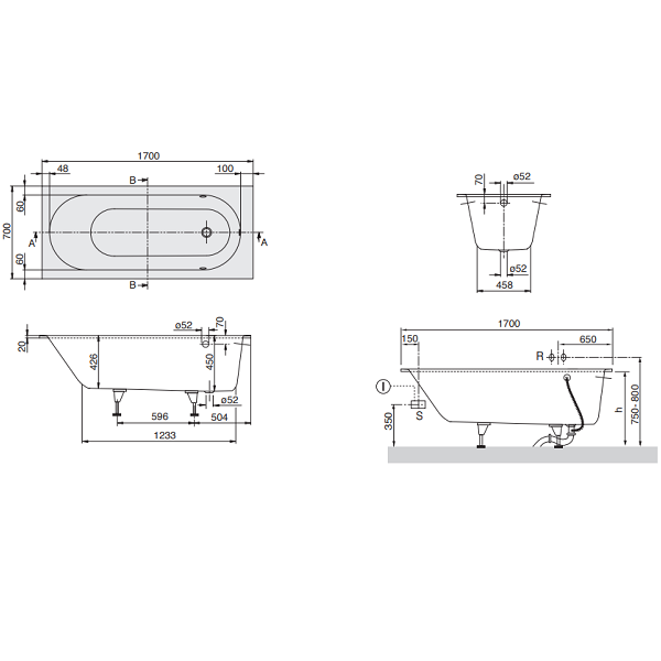 Ванна, Villeroy&Boch, Oberon, ширина, мм-1700, глубина, мм-700, высота, мм-450, водоизмещение (л)-135, форма-овальная, диаметр слива, мм-52, ножки-есть, материал-Quaryl, цвет-белый Ванна, Villeroy&Boch, Oberon, шгв 1700*700*450, цвет-белый