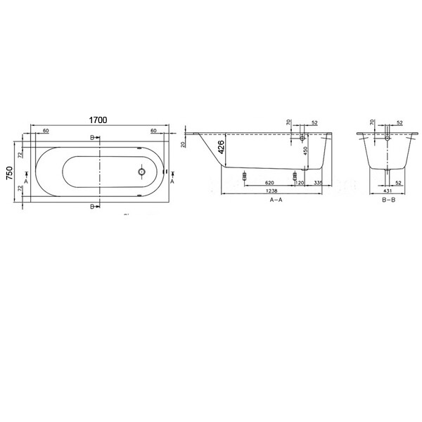 Ванна, Villeroy&Boch, Oberon, ширина, мм-1700, глубина, мм-750, высота, мм-450, водоизмещение (л)-135, тип установки-встраиваемый, форма-прямоугольная, слив-перелив-необходимо заказать, диаметр слива, мм-52, ножки-есть, материал-Quaryl, цвет-белый Ванна, Villeroy&Boch, Oberon, шгв 1700*750*450, цвет-белый