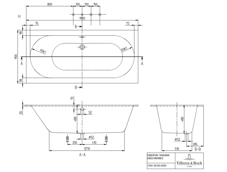 Ванна, Villeroy&Boch, Oberon, ширина, мм-1900, глубина, мм-900, высота, мм-480, водоизмещение (л)-218, тип установки-встраиваемый, форма-прямоугольная, слив-перелив-необходимо заказать, диаметр слива, мм-52, ножки-есть, материал-Quaryl, цвет-белый Ванна, Villeroy&Boch, Oberon, шгв 1900*900*480, цвет-белый