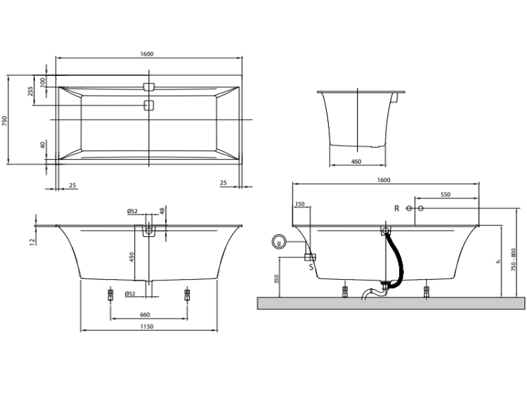 Ванна, Villeroy&Boch, Squaro Edge 12 Duo, ширина, мм-1600, глубина, мм-750, высота, мм-450, водоизмещение (л)-160, форма-прямоугольная, слив-перелив-в комплекте, диаметр слива, мм-52, ножки-есть, материал-Quaryl, цвет-белый Ванна, Villeroy&Boch, Squaro Edge 12 Duo, шгв 1600*750*450, цвет-белый