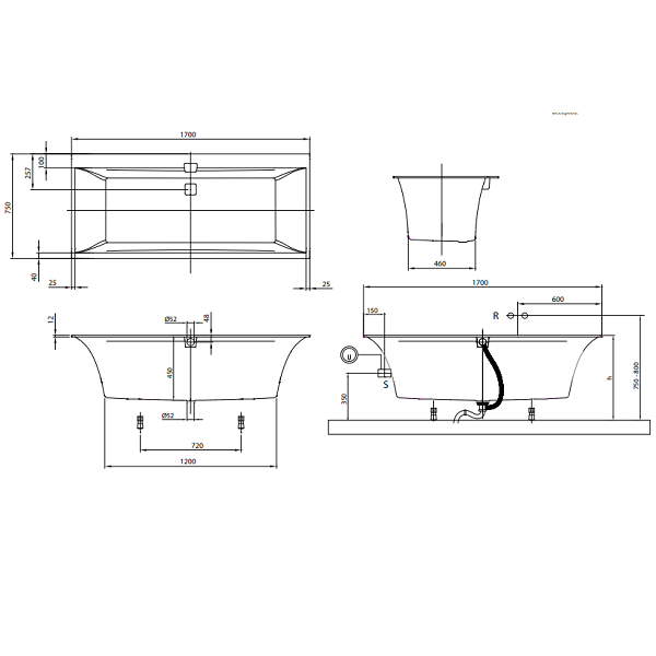 Ванна, Villeroy&Boch, Squaro Edge 12 Duo, ширина, мм-1700, глубина, мм-750, высота, мм-450, водоизмещение (л)-165, форма-прямоугольная, слив-перелив-в комплекте, диаметр слива, мм-52, ножки-есть, материал-Quaryl, цвет-белый Ванна, Villeroy&Boch, Squaro Edge 12 Duo, шгв 1700*750*450, цвет-белый