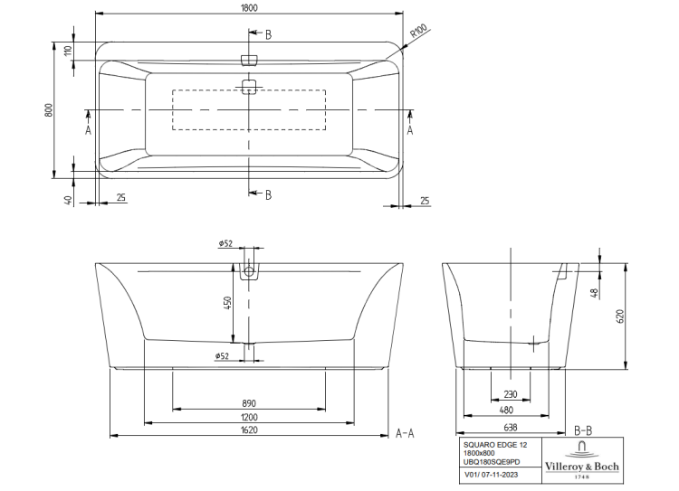 Ванна, Villeroy&Boch, Squaro Edge 12, ширина, мм-1800, глубина, мм-800, высота, мм-620, водоизмещение (л)-180, тип установки-отдельностоящий, форма-прямоугольная, панель-есть, слив-перелив-в комплекте, диаметр слива, мм-52, материал-Quaryl, цвет-камень белый (Stone White) Ванна, Villeroy&Boch, Squaro Edge 12, шгв 1800*800*620, цвет-камень белый (Stone White)