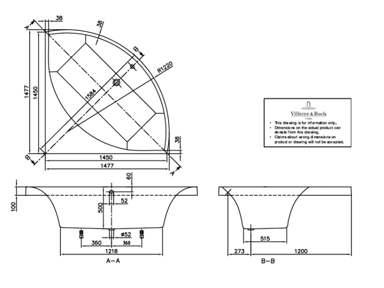 Ванна, Villeroy&Boch, Squaro, ширина, мм-1450, глубина, мм-1450, высота, мм-500, водоизмещение (л)-240, тип установки-угловой, форма-четверть круга, слив-перелив-необходимо заказать, диаметр слива, мм-52, ножки-есть, материал-Quaryl, цвет-альпийский белый Ванна, Villeroy&Boch, Squaro, шгв 1450*1450*500, цвет-альпийский белый