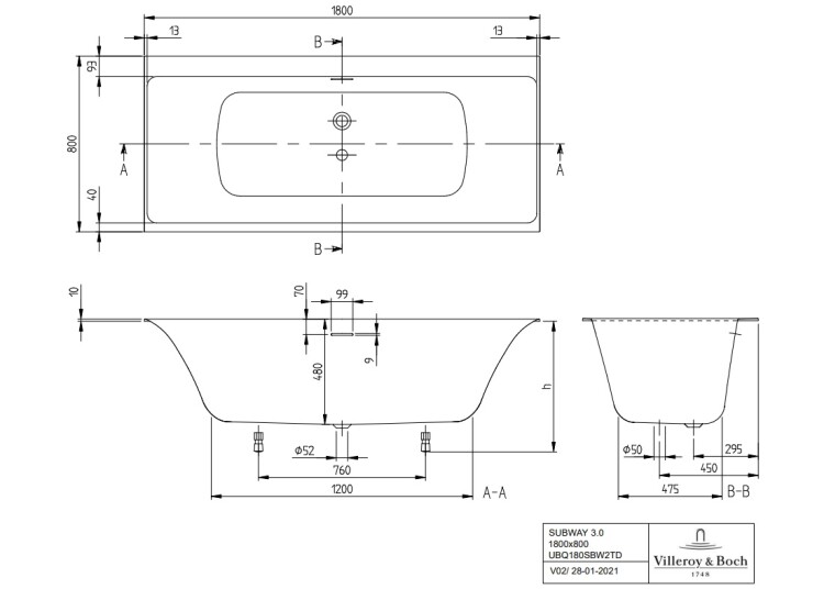 Ванна, Villeroy&Boch, Subway 3.0, ширина, мм-1800, глубина, мм-800, высота, мм-480, водоизмещение (л)-219, тип установки-встраиваемый/пристенный, форма-прямоугольная, слив-перелив-в комплекте, слив в цвет ванны, перелив хромированный, диаметр слива, мм-52, ножки-есть, материал-Quaryl, цвет-альпийский белый, с системой наполнения ванны SilentFlow, установленная в дне ванны Ванна, Villeroy&Boch, Subway 3.0, шгв 1800*800*480, цвет-альпийский белый, с системой наполнения ванны SilentFlow