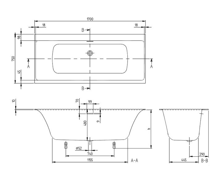 Ванна, Villeroy&Boch, Subway, ширина, мм-1700, глубина, мм-750, высота, мм-480, водоизмещение (л)-183, тип установки-встраиваемый/пристенный, форма-прямоугольная, слив-перелив-в комплекте, диаметр слива, мм-52, ножки-есть, материал-Quaryl, цвет-камень белый (Stone White) Ванна, Villeroy&Boch, Subway, шгв 1700*750*480, цвет-камень белый (Stone White)