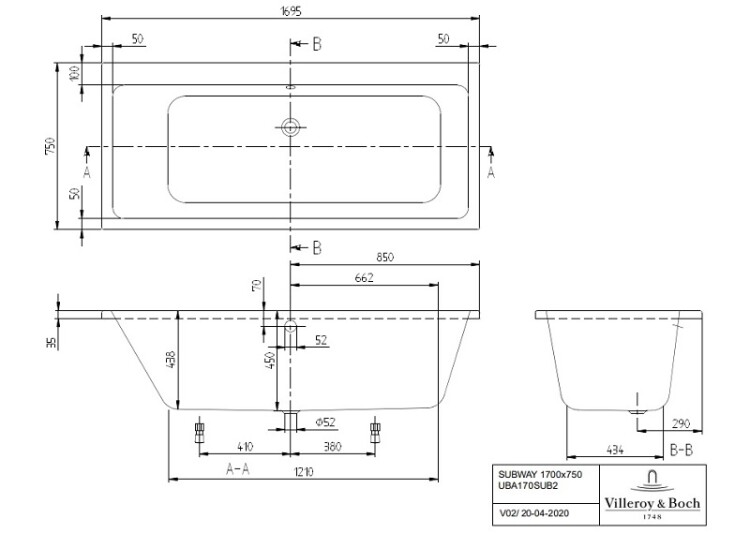 Ванна, Villeroy&Boch, Subway, ширина, мм-1700, глубина, мм-750, высота, мм-450, водоизмещение (л)-160, тип установки-встраиваемый/пристенный, форма-прямоугольная, слив-перелив-необходимо заказать, диаметр слива, мм-52, ножки-необходимо заказать, материал-акрил, цвет-альпийский белый Ванна, Villeroy&Boch, Subway, шгв 1700*750*450, цвет-альпийский белый