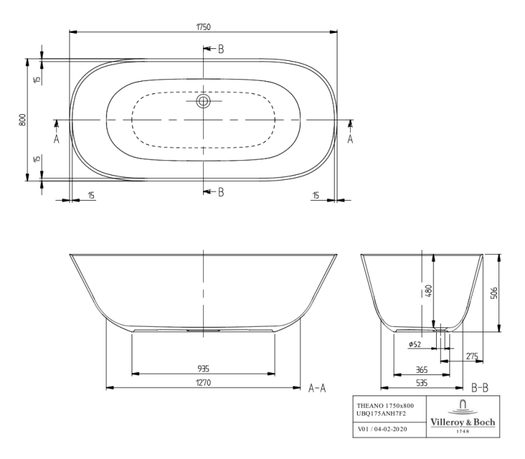 Ванна, Villeroy&Boch, Theano, ширина, мм-1750, глубина, мм-800, высота, мм-480, водоизмещение (л)-315, тип установки-отдельностоящий, форма-овальная, панель-есть, слив-перелив-необходимо заказать, диаметр слива, мм-52, материал-Quaryl, цвет-камень белый (Stone White) Ванна, Villeroy&Boch, Theano, шгв 1750*800*480, цвет-камень белый (Stone White)